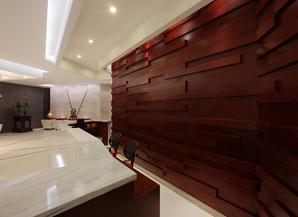 大偉實業是一家經營工藝品配飾的公司,本空間以木為元素,從地面、墻體及屏風都運用了木,巧妙的將其融合到一起。