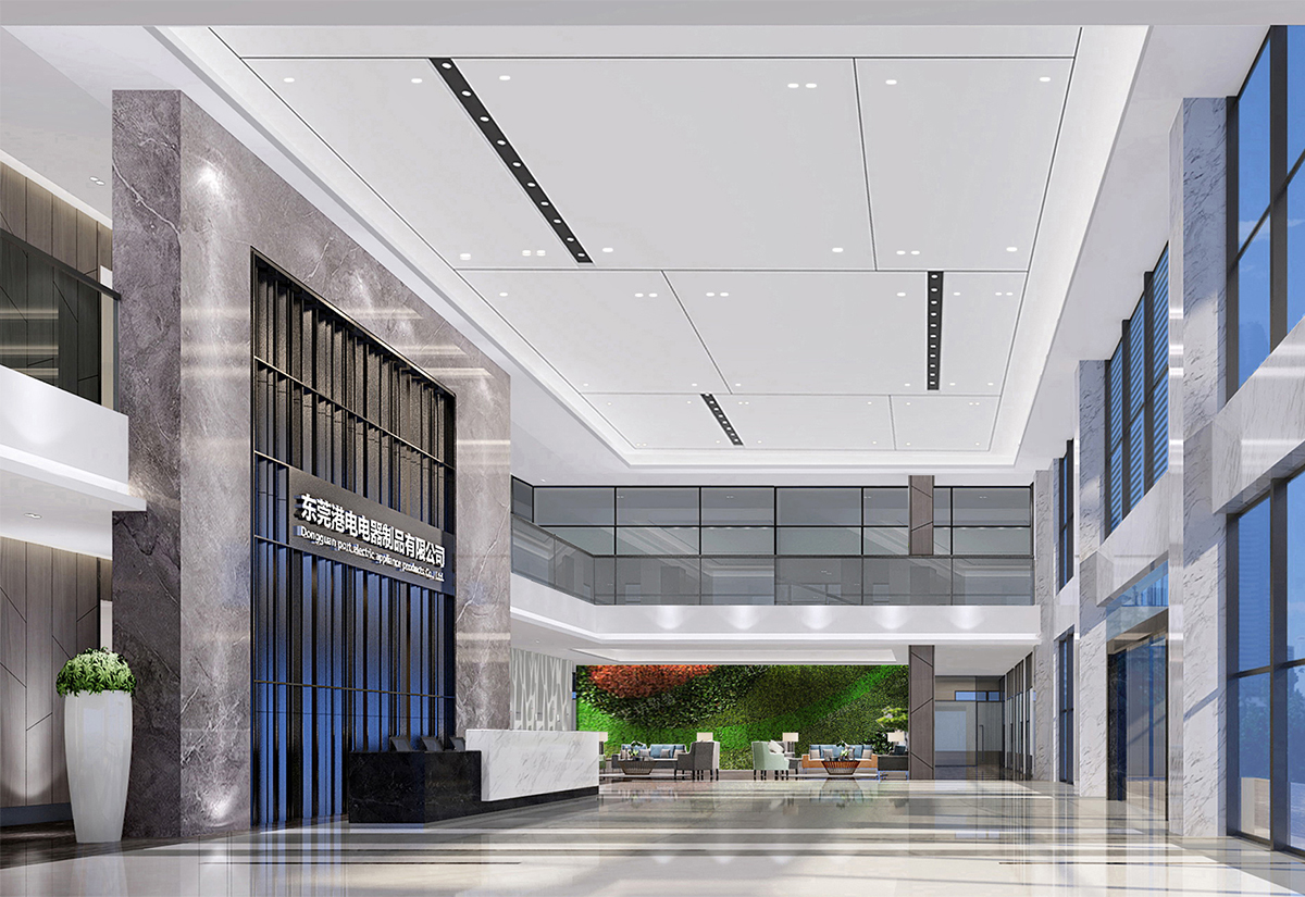 港電電器是一家以生產和銷售小家電制品、電子玩具、快速閃燈、塑膠文具、聽覺保護器的企業。本案在設計構思上采用:時尚、冷峻、節能、環保。材料上彩用:黑鋼、灰色大理石、灰色玻璃。體現主題:環??臻g、突出藝術形態、體現企業個性。主色調:黑、白、灰,這些都是樸素的顏色,卻能表現出空間高雅、理性和高效。表現形態:樹林,寓意企業茂盛、團結、強大,給人參差與和諧之美、穩定與輕巧之美、節奏與韻律之美、多樣與統一之美。
