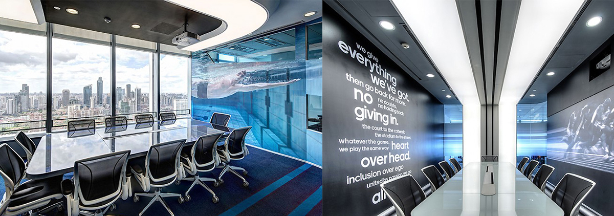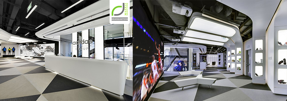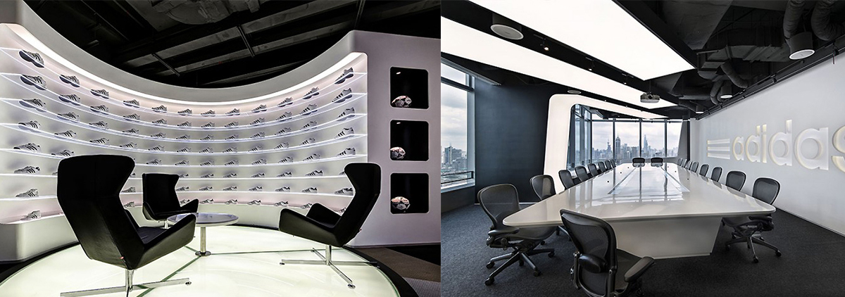 阿迪達斯制造頂尖水平的運動鞋,運動服和配飾的集團,現代、時尚、彰顯個性為本案的靈魂,體現出企業的文化與魄力。提取黑、白、灰為本案的主色調,將簡約與唯美、明晰與蒙朧、真實與虛幻的具有多維互補的設計語言——消解、重構,在多元復合的結構中建構富有創意的視覺空間。