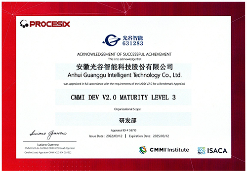 近日,在光谷團隊的互相配合與努力下,我司通過了評審組嚴格評估,取得軟件能力成熟度集成模型(CMMI)三級資質證書,評審結果已刊登在CMMI研究院網站上。成功獲得該項資質認證, 表明了安徽光谷智能科技股份有限公司的軟件系統研發和質量管理能力得到國際權威認可。