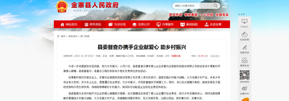 為進一步鞏固脫貧攻堅成果,助力鄉村振興,2021年11月17日,金寨縣委督查辦攜手愛心企業安徽光谷智能科技股份有限公司前往張沖鄉黃畈村開展愛心捐贈。縣委督查辦、縣重點工程處和張沖鄉相關負責同志參加活動。