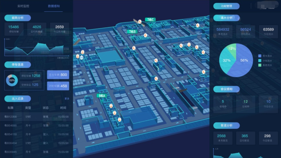 在智慧園區的建設中,園區的管理會直接影響企業的效率、成本和發展。智慧園區產業運營服務平臺以精益化管理、精細化服務目標為前提,以數字孿生、三維實景技術,GIS、BIM(基于建筑信息模型)為依托,建設園區CIM(三維城市信息模型)基礎平臺實現數據融合共享與業務高效對接。通過推進技術融合、業務融合及數據融合,整合應用服務資源,形成統一的數據支撐平臺打破園區“信息孤島”;提高園區信息聯通效率,實現業務管理信息、重點專項統計和監測預警信息的“一屏感知”,即時體現園區和各業務部門運作的重要指標值,展示各模塊重點信息,供管理者了解情況并決策,提高園區運行效益和管理效率。