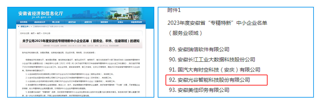 安徽省工業和信息化廳公布了“2023年度安徽省專精特新中小企業名單”。安徽光谷智能科技股份有限公司經申報和評審成功入選,榮獲“安徽省專精特新中小企業”稱號。該榮譽是經企業自主申報,各省市工信局初審推薦基礎上,經專家組評審等程序后認定的創新能力強、代表中堅力量的優質中小企業。