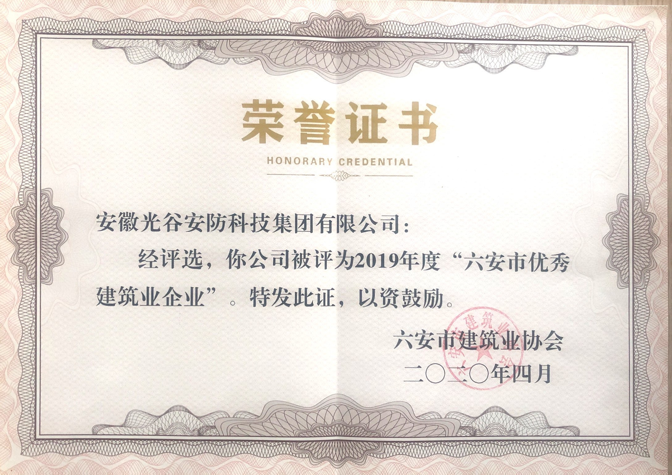 安徽光谷安防科技集團有限公司自成立以來始終堅持爭先創優,近年來,企業管理水平和綜合實力不斷提升,資信和知名度不斷提高,市場競爭力不斷增強,在促進六安市建筑業健康發展方面做出了積極的貢獻。經六安市建筑業協會綜合評選,安徽光谷安防科技集團有限公司榮獲2019年度“六安市優秀建筑業企業”殊榮。